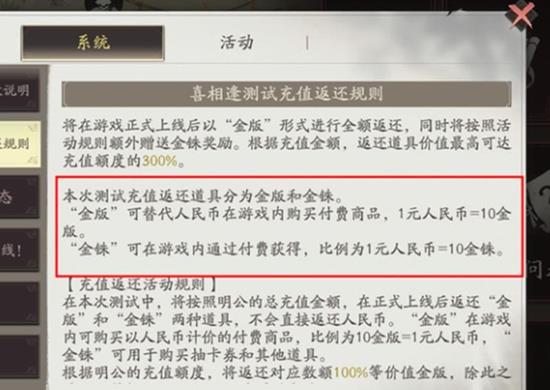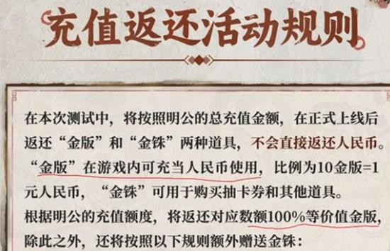 返还规则分为基础返还和额外赠送两部分。首次充值可获得100%的金版返还,比如充值100元获得1000金版,充值198元获得1980金版。