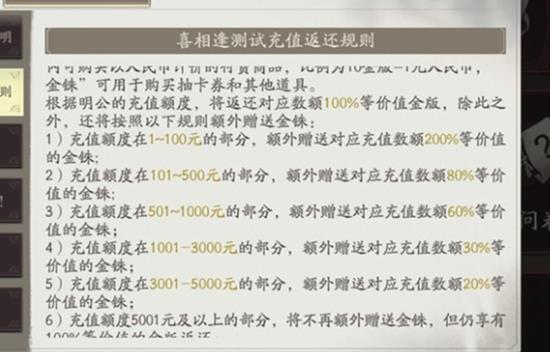 举例说明具体计算方式。充值6元属于1-100元档位,可获得60金版和120金铢。充值198元需要分段计算:100元部分按200%返还金铢,98元部分按80%返还。总共获得1980金版,金铢计算为100×200%×10加上98×80%×10,合计2784金铢。这样的返还机制让玩家在正式服能获得大量抽卡资源。