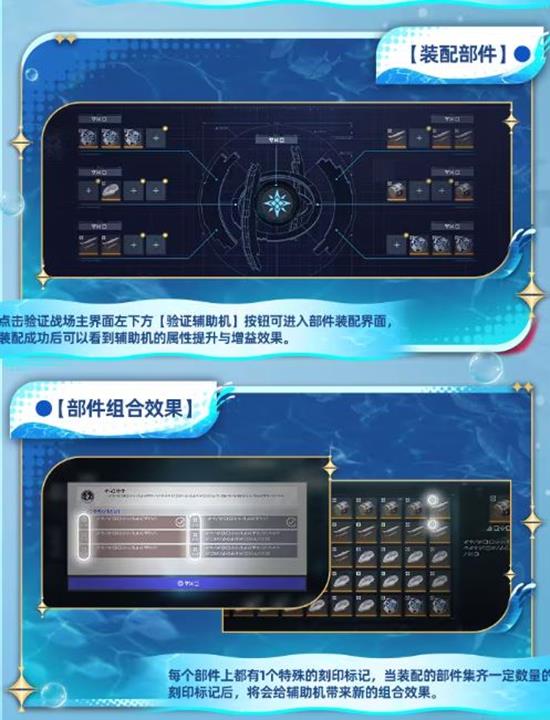 每个部件上都有一个特殊的刻印标记,当装配的部件集齐一定数量的刻印标记后,将会给辅助机带来新的组合效果。
