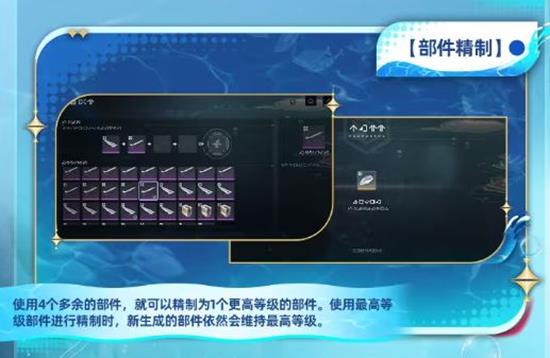 使用4个多余的部件,就可以精制为1个更高等级的部件。使用最高等级部件进行精制时,新生成的部件依然会维持最高等级。