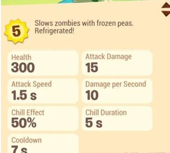 寒冰射手的核心机制延续了前作的经典设定。它能够向正前方发射冰豌豆攻击敌人,每次造成15点伤害,攻击间隔约为1.5秒,平均每秒输出10点。虽然单次伤害偏低,但其真正的价值在于附带的减速效果。被冰豌豆击中的僵尸会受到50%的移速削减,持续时间长达5秒。这一特性使得僵尸接近防线的速度大幅降低,为后排输出植物争取了宝贵的反应时间,在植物大战僵尸3的关卡推进中具有极高的战术价值。