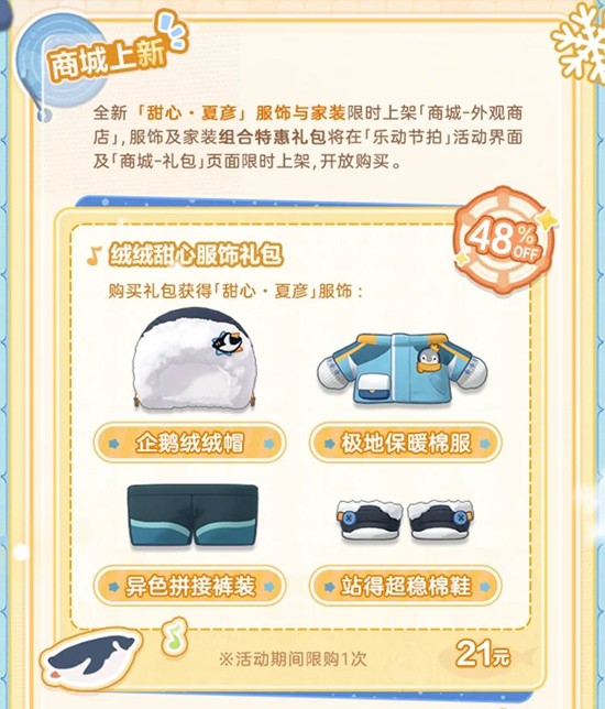 活动期间,全新「甜心·夏彦」服饰与家装限时上架「商城-外观商店」,服饰及家装组合特惠礼包将在「乐动节拍」活动界面及「商城-礼包」页面限时上架,开放购买