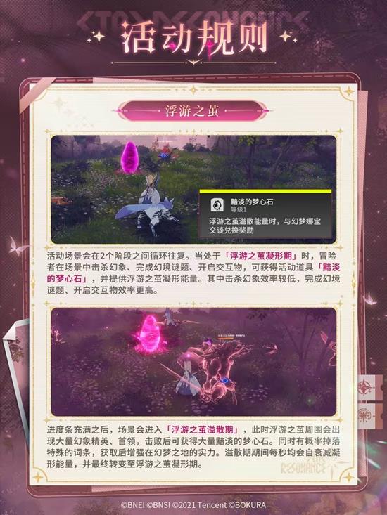 活动场景会在2个阶段之间循环往复。当处于「浮游之茧凝形期」时,冒险者在场景中击杀幻象、完成幻境谜题、开启交互物,可获得活动道具「黯淡的梦心石」,并提供浮游之茧凝形能量。其中击杀幻象效率较低,完成幻境谜题、开启交互物效率更高。