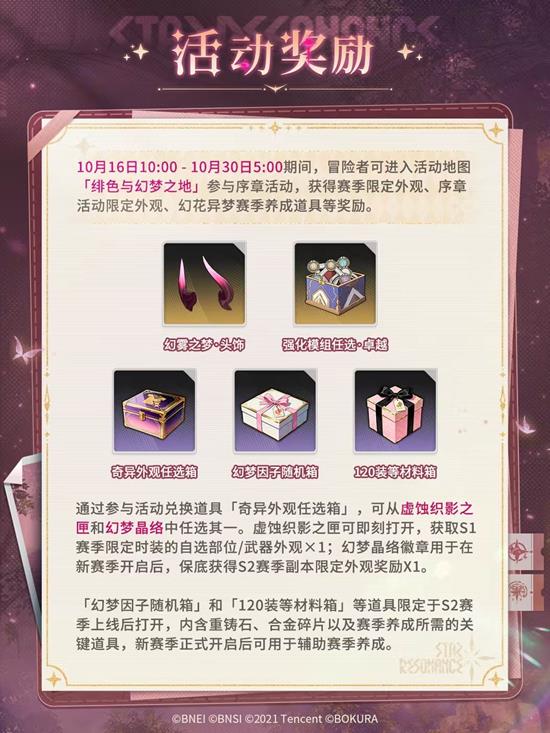 从10月16日10:00至10月30日5:00期间,冒险者们可以进入活动地图「绯色与幻梦之地」参与序章活动,获得赛季限定外观、序章活动限定外观、幻花异梦赛季养成道具等奖励。