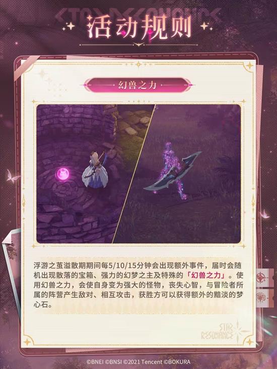 浮游之茧溢散期间每5/10/15分钟会出现额外事件,届时会随机出现散落的宝箱、强力的幻梦之主及特殊的「幻兽之力」。使用幻兽之力,会使自身变为强大的怪物,丧失心智,与冒险者所属的阵营产生敌对、相互攻击,获胜方可以获得额外的黯淡的梦心石。