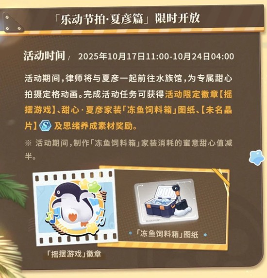 活动期间,律师将与夏彦一起前往水族馆,为专属甜心拍摄定格动画。完成活动任务可获得活动限定徽章【摇摆游戏】、甜心·夏彦家装「冻鱼饲料箱」图纸、【未名晶片】及思绪养成素材奖励