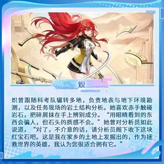 炽曾跟随科考队辗转多地,负责地表与地下环境勘测,以及任务现场的岩土结构分析。她喜欢赤手触碰岩石,把碎屑抹在手上辨别成分。“用眼睛看到的东西会骗人,但石头的质感不会。”她曾对分析员阁下收下这块红宝石吧。这是我在家乡的土地上发掘出的,作为拯救世界的英雄,我认为您很适合拥有它。”