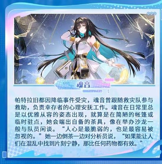 帕特拉旧都因降临事件受灾,魂音曾跟随救灾队参与救助,负责幸存者的心理安抚工作。魂音在平日里总是以优雅从容的姿态出现,就算是在简陋的帐篷或临时驻点,她会端出自备的茶具,像在举办沙龙一般与队员闲谈。“人心是最脆弱的,也是最容易被忽视的。”她一边倒茶一边对分析员说,“如果能让们在混乱中找到片刻宁静,那比任何药物都有效。”