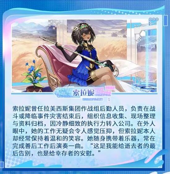 索拉妮曾任拉美西斯集团作战组后勤人员,负责在战斗或降临事件灾害结束后,组织信息收集、现场整理与资料归档,因冷静细致的执行力转入公司。在外人眼中,她的工作无疑会令人感觉压抑,但索拉妮本人却经常保持着温和的笑容。她随身携带着乐器,常在完成善后工作后演奏一曲。“这是我能给逝去者的最后告别,也是给幸存者的安慰。”