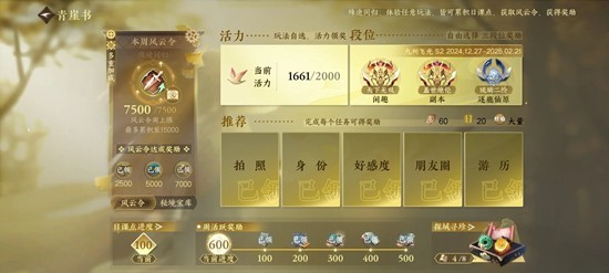 (副本建议周一打,周一人比较多,周一有概率开新的金色游历建议直接做完,也可以去挂乐园币换衣服,庄园要去卖菜换风云令这样你在第一天就可以获得大量风云令换交子狗粮,身份可以去做一个丝线完成闲趣任务。)