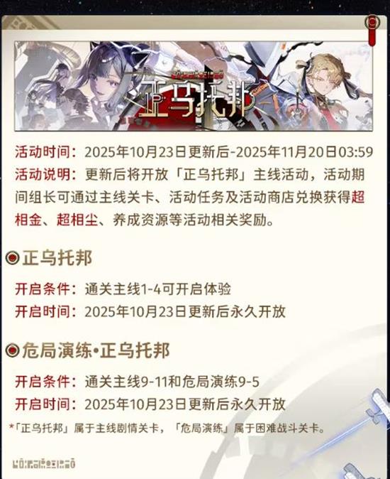 活动说明:更新后将开放「正乌托邦」主线活动,活动期间组长可通过主线关卡、活动任务及活动商店兑换获得超相金、超相尘、养成资源等活动相关奖励。