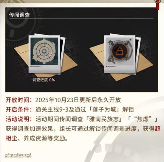 活动说明:活动期间,组长可通过传闻调查「雅南民族志」、「焦虑」获得调查加速效果,组长可通过解锁传闻调查进度,获得超相尘、养成资源等奖励。