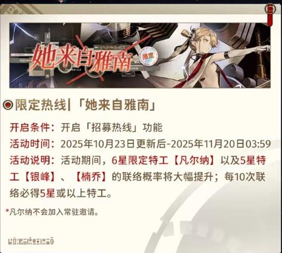 限定热线「她来自雅南」:活动期间,6星限定特工【凡尔纳】以及5星特工【银峰】、【楠乔】的联络概率将大幅提升;每10次联络必得5星或以上特工。
