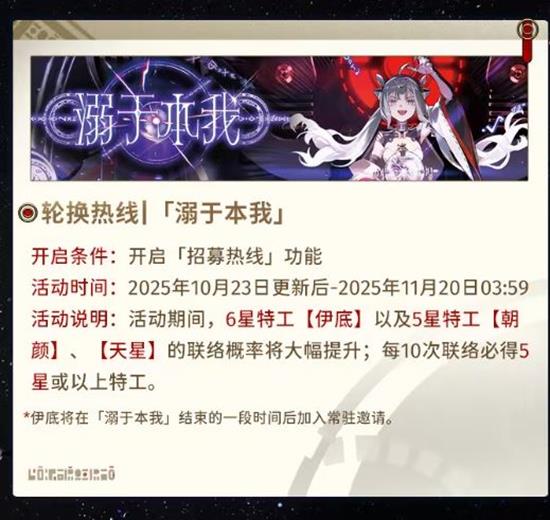 轮换热线「溺于本我」:活动期间,6星特工【伊底】以及5星特工【朝颜】、【天星】的联络概率将大幅提升;每10次联络必得5星或以上特工。