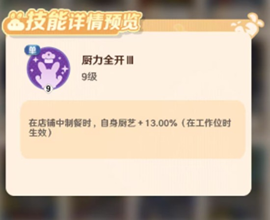 另一项强力技能为厨艺交响,属于团队增益型主动技能。当店铺进入忙碌阶段,玩家可手动激活此技能,使店内所有店员的厨艺值立即提升150点。这一加成效果显著,尤其适用于应对连续高难度订单或限时挑战任务。配合皮皮自身的高厨艺基础,整个厨房的出餐速度和菜品品质都会迎来质的飞跃。此外,皮皮每次完成烹饪后,自身厨艺还会额外增长13%,形成良性循环,进一步巩固其在厨房中的核心地位。