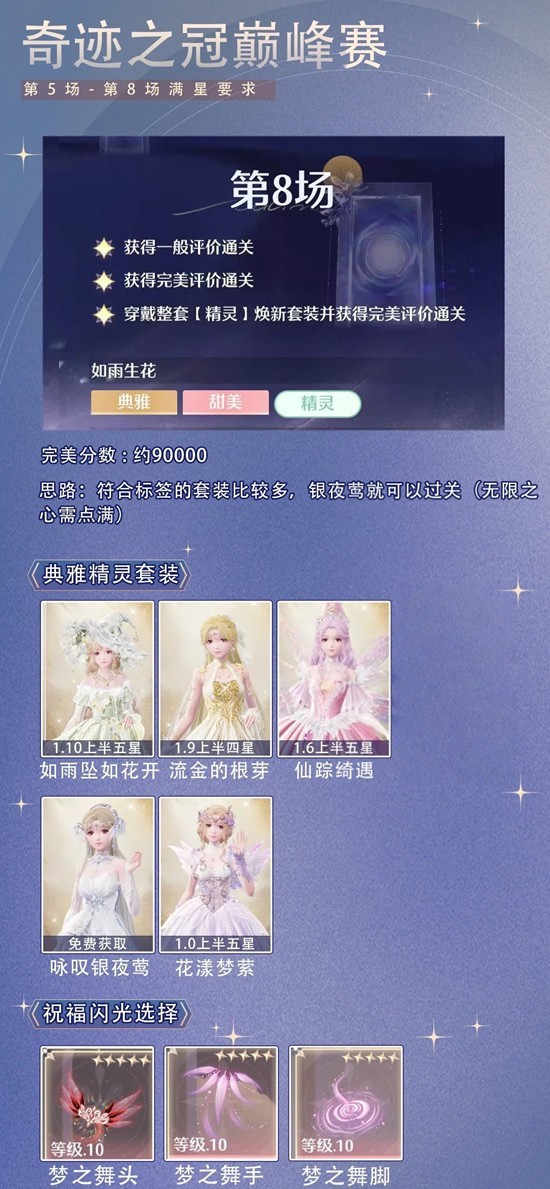 > 第8场【精灵】标签套装有很多,除去当期五星【如雨坠如花开】还有符合标签的【仙踪绮遇】外还有如图所示套装,亲测【咏叹银夜莺】和【花漾梦萦】可过关,不符合【典雅】标签的四星套装不用考虑,过不了关。