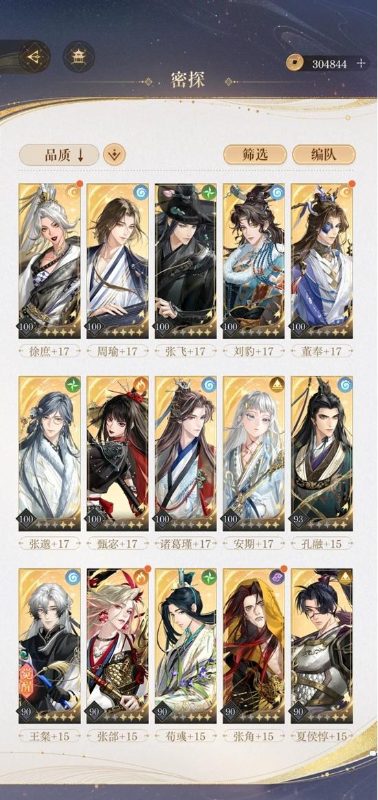50+7以下的密探:郭嘉|虞翻、张仲景、荀攸、蔡琰、甘宁、陆逊、张燕、干吉、张修、太史慈、曹植、葛洪|郭解、蒯越、祢衡,等级什么的还没被拉起来,而且五阶段主流攻略里也很少看到他们的身影。
