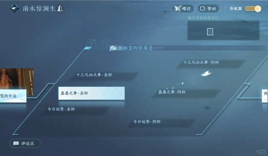 前边有个掷杯筊的节点有六个分支,三个选项各有两个不同结果,如果都想点亮的话梦回"掷筊问签筹",跑到"危澜渐起"就可以退出梦回了,这里掷杯筊的时候