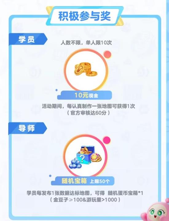 导师:随机宝箱,上限50个,学员每发布1张数据达标地图,可得随机蛋币宝箱*1(金豆子≥100&游玩量>1000)。