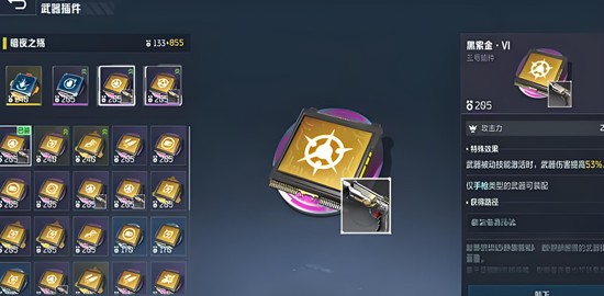除了强击插件外,黑索金插件是另一项关键选择。当暗夜之殇激活被动后,黑索金能直接提升53%的伤害,这一增益在当前所有插件中属于顶尖水平,几乎不可替代,大幅拉高了武器的理论伤害上限。而雷酸汞插件则侧重技能释放频率的提升,能够让玩家更频繁地触发技能连招,在连发操作和技能衔接上更具优势,适合追求操作流畅度的玩家使用。