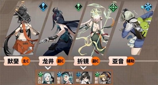 新月同行中亚音最适配的阵容为默斐主C+龙井副C+折镜副C+亚音辅助。该组合能最大化亚音的增益效果与团队输出联动。亚音在0门满认证状态下,可为主C提供最高45%攻击力加成、60%普攻伤害加成以及40%暴击率,若再叠加谐波层数,还能额外提供最多30%普攻伤害加成。折镜在该体系中不可替代,其技能机制可频繁触发队伍中攻击最高者的普攻,快速为亚音的谐波积累层数,同时附加易伤效果,进一步放大主C输出。默斐作为核心输出,具备高频率普攻能力和自我增伤机制,完美契合亚音的加成体系。龙井则承担副C职责,其技能可降低敌人20%物理防御并附带溅射伤害,有效清理残血目标,若替换为结,也可提供12%所受伤害提升与高额减伤,增强队伍生存能力。