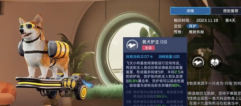 飞天小柯基是星球重启中人气很高的宠物之一。它的电光飞弧技能可以发射激光弧对单个敌人造成伤害,一级时就能造成60%攻击力的伤害。萌犬护主技能能让它传送到主人身边开启能量装置,为场内所有队友提供护盾并提升暴击伤害。经历旺盛技能在击杀敌人后能为主人提供暴击伤害加成并回复自身生命值。
