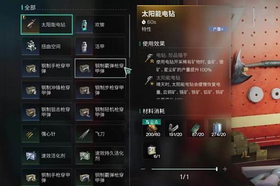 想要提高采集效率,玩家可以在模因界面选择太阳能电钻专精和电钻珍品猎手专精,这样采集稀有矿石时就能保证100%的产量。
