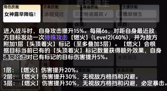 露早的主动技能女神露早降临在战斗开局即可发挥作用,提供自身攻击提升15%的增益效果。同时每6秒自动对距离最近的敌人发动一次特殊攻击【燃火】,并附加【头顶着火】标记,该标记最多叠加三层。每层标记不仅提升露早对目标的通常攻击伤害5%,还会增强【燃火】的附加效果。当标记达到一层时,【燃火】伤害提升20%;两层时提升至30%,并可无视敌方格挡与闪避;三层时依旧为30%伤害加成,但额外附加必定暴击效果,显著提升爆发能力。