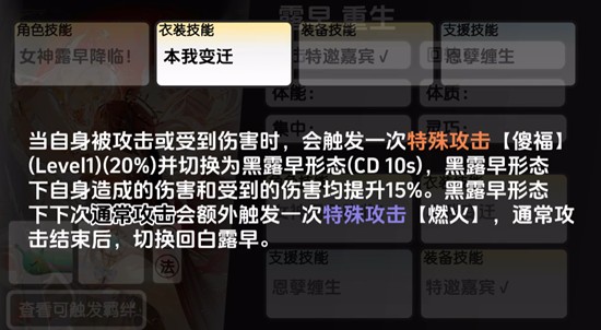 露早的衣装技能本我变迁触发条件为受到攻击或伤害时,会立即发动一次【傻福】特殊攻击,并切换为黑露早形态,持续10秒。在此形态下,露早自身造成的伤害与受到的伤害均提升15%。同时,下一次通常攻击将额外触发一次【燃火】攻击,形成短时间内的输出爆发窗口。该形态结束后自动回归白露早状态,形成攻防节奏的循环,使她在承受伤害的同时转化为输出优势。