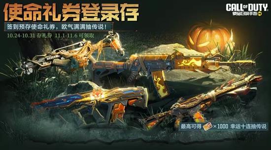 10月24日(本周五),使命礼券登录存活动上线,战士们签到预存使命礼券,即可在11月1日(下周六)领取十连抽,用来抽取传说武器啦。瘦普祝战士们欧气满满哦~