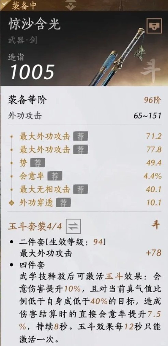 首先就是新版本boss伤害问题,那可是都有高额持续爆发伤害的boss,玉斗套要求什么?对真气比例低于自己或者40%的目标生效7.5直接会意率。但是想一直吃7.5的直接会意加成,就需要你去卸势或者躲避所有掉真气的机制,不然这个加成就很难持续吃到。因为boss随便一个攻击都能削你半管真气。
