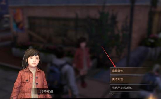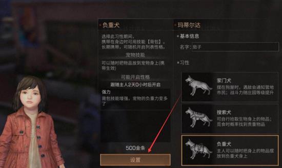 与玛蒂尔达对话后会出现两个选项,选择宠物属性即可进入技能更换界面。明日之后为狗狗提供了三种技能类型:家门犬、搜索犬和负重犬。每个技能都有不同的作用,玩家可以根据自己的需求选择合适的技能。