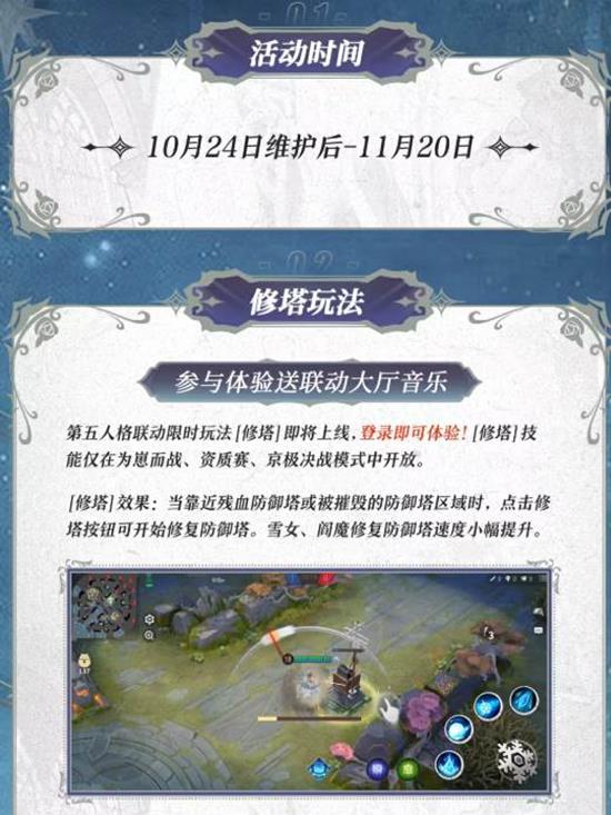 《第五人格》联动限时玩法[修塔]即将上线,登录即可体验。[修塔]技能仅在为崽而战、资质赛、京极决战模式中开放。当靠近残血防御塔或被摧毁的防御塔区域时,点击修塔按钮可开始修复防御塔。雪女、阎魔修复防御塔速度小幅提升。
