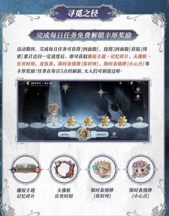 活动期间,完成每日任务可获得[四面骰],投掷[四面骰]获取[线索]累计达到一定进度后,即可获取播报主题:记忆碎片、头像框:狂欢时刻、皮肤券、限时表情牌[你好呀]、限时表情牌[小心点]等丰厚奖励!任务在每日5点时刷新,大人们可别错过啦。