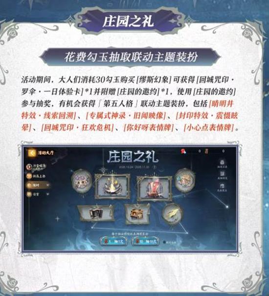 活动期间,大人们消耗30勾玉购买[缪斯幻象]可获得[回城咒印·罗伞·一日体验卡]*1并附赠[庄园的邀约]*1,使用[庄园的邀约]参与抽奖,有机会获得[第五人格]联动主题装扮,包括[晴明井特效·线索回溯]、[专属式神录·旧闻映像]、[封印特效·震慑眩晕]、[回城咒印·狂欢危机]、[你好呀表情牌]、[小心点表情牌]。