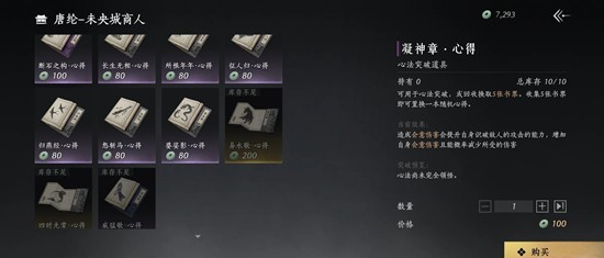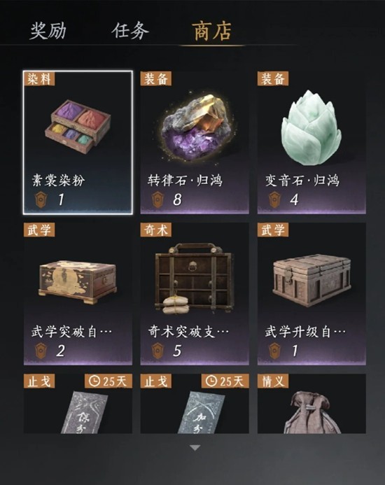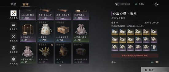 战斗养成:心法散本,必囤。武学突破,必囤。奇术突破必囤。一袋宝钱:体力有富裕都可以购买。啸玉,振玉,必囤(叠音物资,奇缺)。