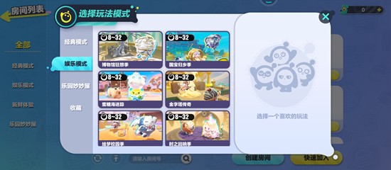 进入蛋仔派对后,在主界面中可以找到“巅峰派对”选项,点击进入即可看到房间创建和加入界面。在房间页面的左侧分类栏中选择“娱乐模式”,这里汇集了多种趣味玩法,其中就包含逃出惊魂夜。浏览列表时,带有“进入”按钮的房间即为正在开放的逃出惊魂夜战局,点击即可快速加入正在进行或等待开始的游戏。