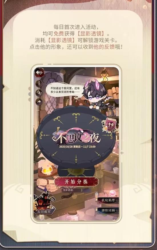 每日首次进入活动,均可免费获得一个【显影透镜】,用于解锁游戏关卡。