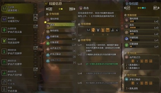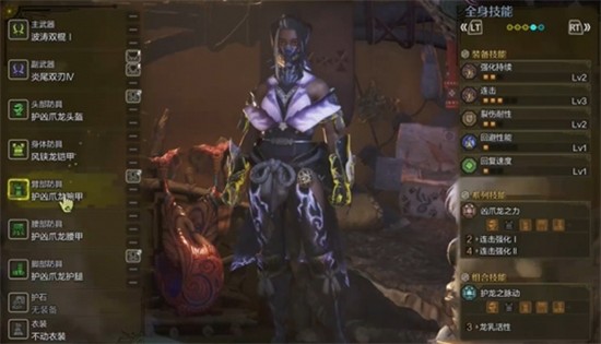 双刀的核心输出机制依赖于连击层数的叠加,因此连击技能的等级至关重要。在下位阶段,击败守护者凶爪龙后可制作四件套凶爪龙装备,这套装备能提供基础的连击加成,为后续配装打下良好基础。此时角色的连击层数增长效率已有明显提升。