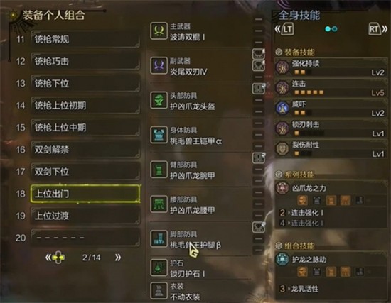 进入上位阶段后,早期遭遇的桃毛兽王成为重要素材来源。通过制作两件桃毛兽王装备并与之前的凶爪龙套装搭配,可将连击技能提升至满级五层。这一阶段的组合兼顾了输出节奏与资源获取效率,适合大多数常规狩猎场景。