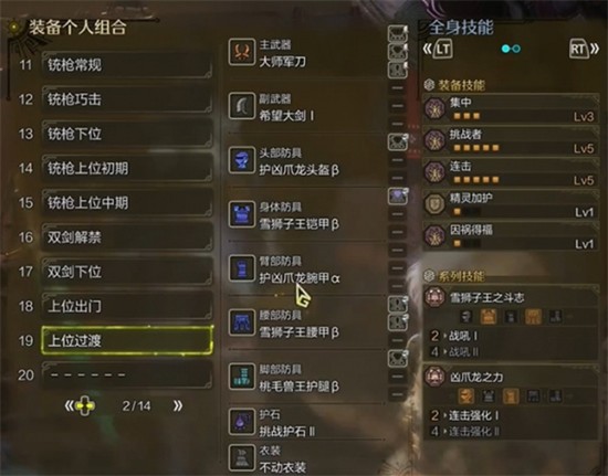若尚未凑齐毕业套装,可采用过渡配装方案:保留凶爪龙两件套,搭配雪狮子与逃猫兽各两件。此组合不仅能维持连击5的加成,还能额外获得挑战者5的增益效果,进一步提升战斗中的攻击力累积速度,适合应对高难度怪物挑战。