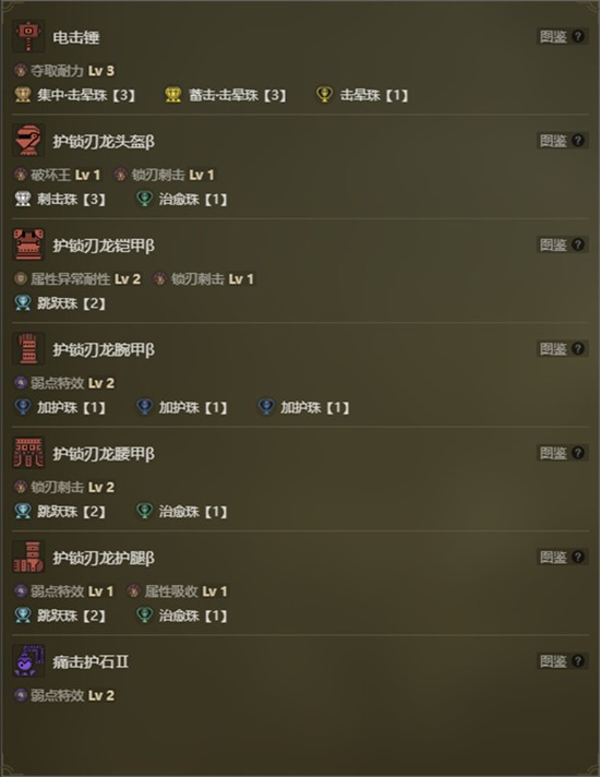 在怪物猎人荒野中,大锤吸血保活配装的核心思路是利用击晕类技能与攻击吸血机制实现边打边恢复生命值的效果。选择电击锤作为武器不仅因其自带电属性伤害,更关键的是它具备较高的打击频率和冲击力,能有效触发吸血相关判定。配合护锁刃龙系列的β防具套装,可以激活套装技能并提供基础防御保障,为近战贴身输出提供安全支撑。