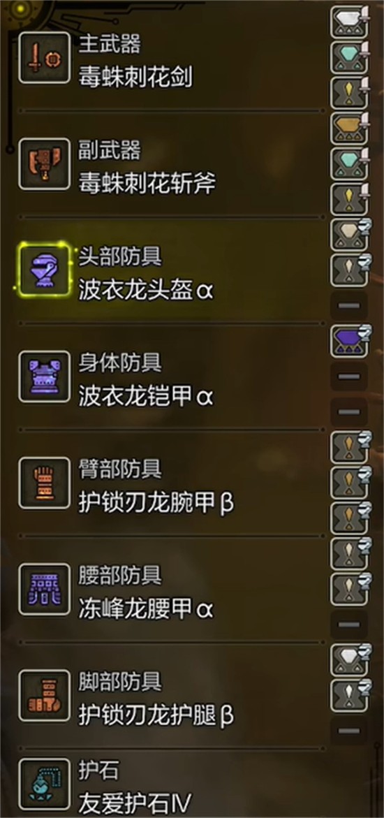 这套怪物猎人荒野中的奶片手剑配装以提升团队辅助效能为核心目标。整体风格偏向支援型玩法,通过高频率使用回复类道具来维持队伍续航。武器选用毒蛛刺花剑,不仅基础性能稳定,还能为后续珠子镶嵌提供有利条件。防具方面采用波衣龙与护锁刃龙混搭组合,兼顾技能触发与插槽需求,在保证一定抗性的同时最大化功能性。