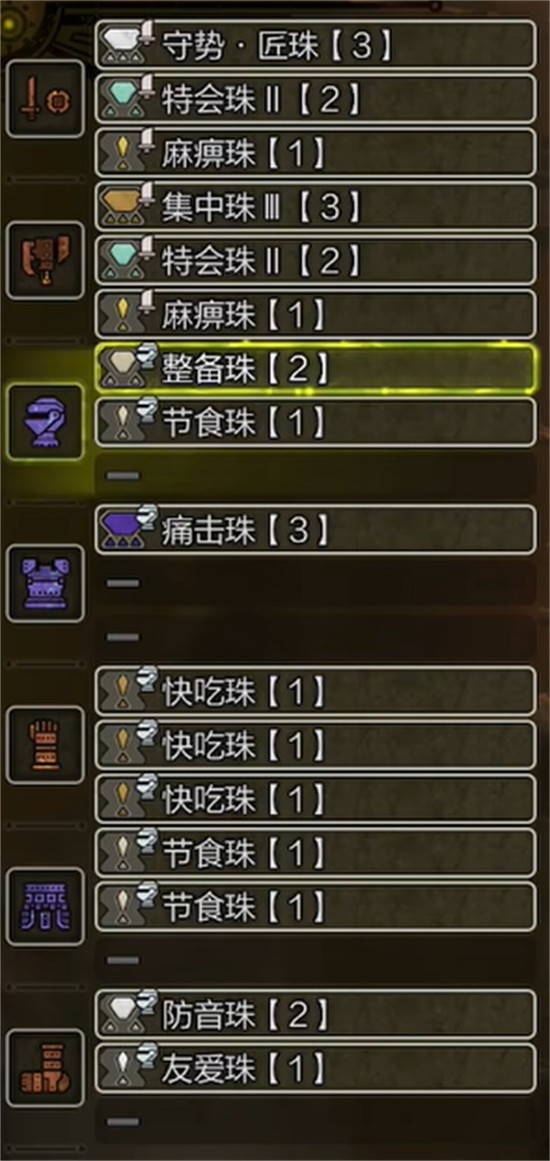 身体部位穿戴波衣龙铠甲α,其自带痛击珠III插槽,进一步强化输出端表现。虽然奶片流侧重治疗,但适度输出仍有助于应对突发状况。痛击珠可提升会心率,配合手剑本身较快的攻击节奏,在必要时刻也能打出可观伤害。此外该装备还具备一定的火属性抗性,适应多种环境挑战。