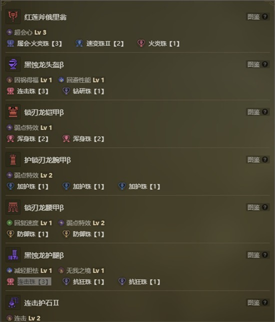 头部选择黑蚀龙头盔β,搭配连击珠【3】与钻研珠【1】,为整体配装提供基础会心率支持。身体部位采用锁刃龙铠甲β,内置两颗浑身珠【2】×2,直接激活浑身技能等级,显著提高完美剑斧解放斩的伤害倍率。此配置在怪物猎人荒野的高周目战斗中尤为关键,能有效提升爆发窗口的输出上限。