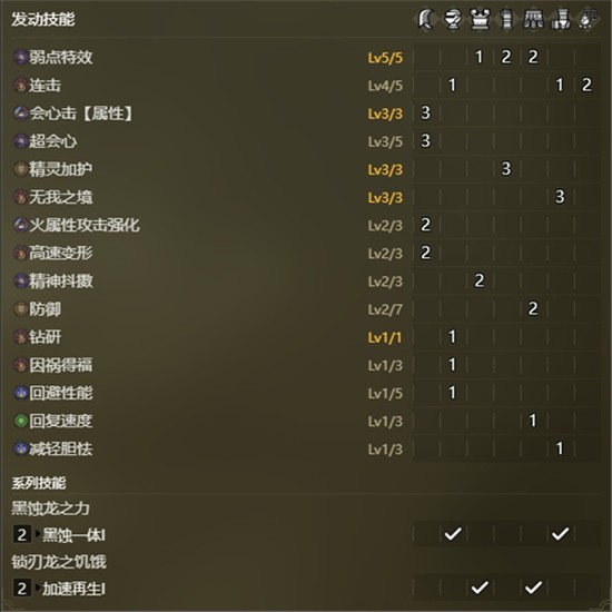 最终成型技能包括满层耐力【90】、连击【3】、加护【1】、抗狂【2】、浑身【1】以及火属性攻击强化【3】以上。这些技能共同作用下,使得盾斧在维持长时间作战的同时,能够稳定打出高会心火属性伤害。怪物猎人荒野中的许多生态机制要求猎人具备抗性与输出双重能力,此套配装正为此类场景设计。