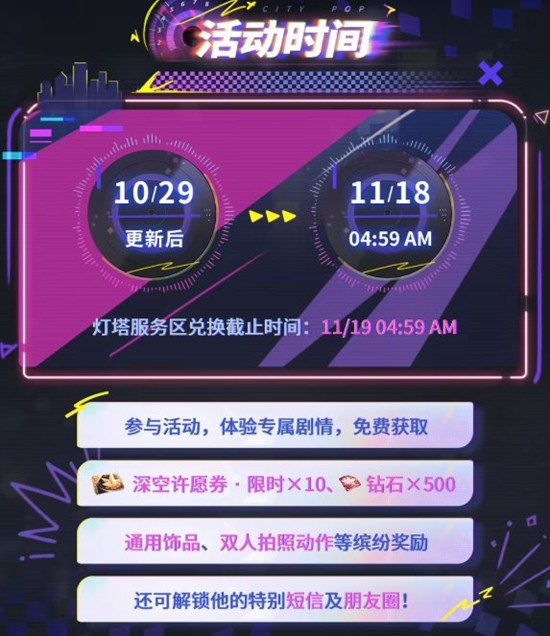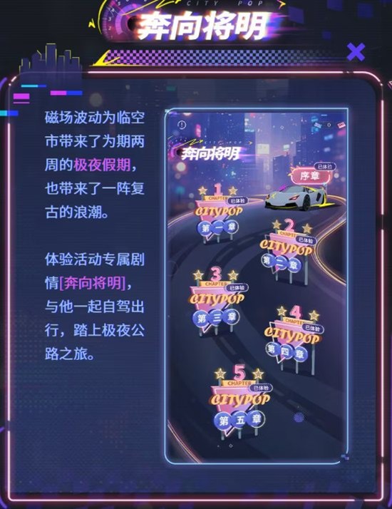 奔向将明:参与活动,体验专属剧情,与他一起自驾出行,踏上极夜公路之旅。磁场波动为临空市带来了为期两周的极夜假期,也带来了一阵复古的浪潮。