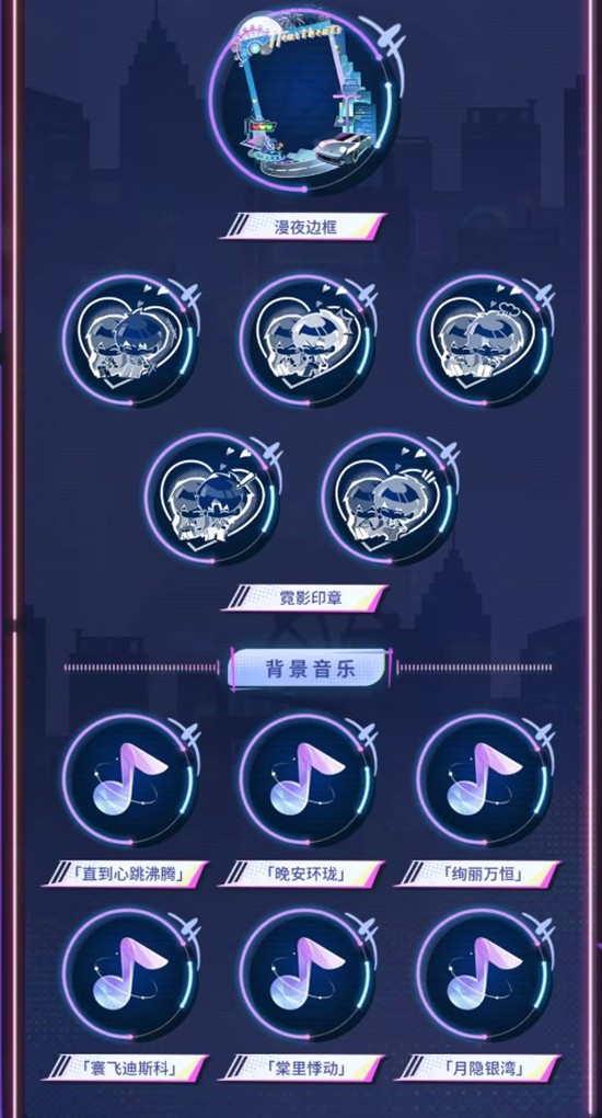 背景音乐「直到心跳沸腾」「晚安环珑」「绚丽万恒」「寰飞迪斯科」「棠里悸动」「月隐银湾」