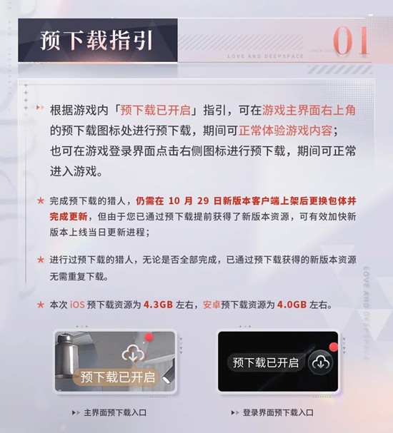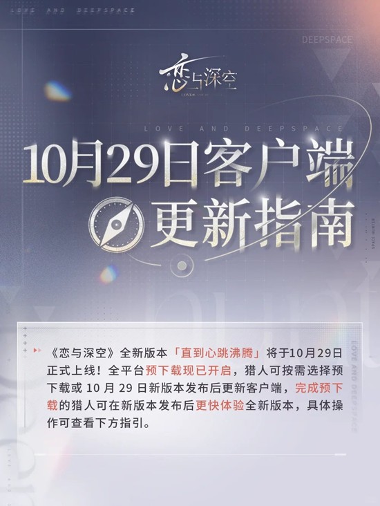 以上就是恋与深空10月29日预下载&客户端更新指引的全部内容了,更多游戏资讯,攻略内容敬请关注切游网,您的支持是我们努力的动力!