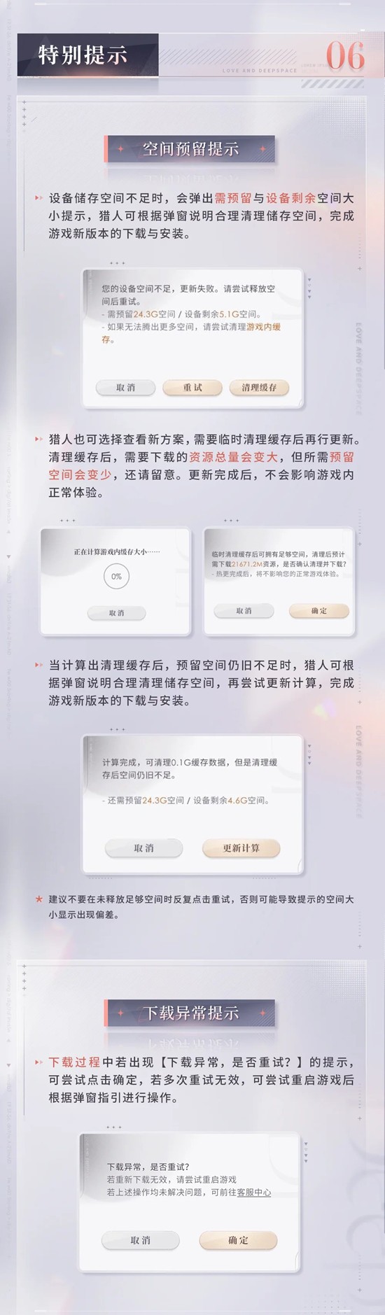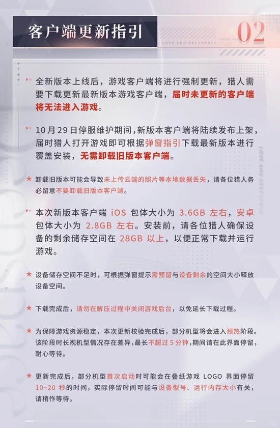 《恋与深空》新版本「直到心跳沸腾」将于10月29日正式上线!10月29日更新后,游戏客户端将进行强制更新,届时未更新的客户端将无法进入游戏。为保障游戏资源稳定,本次更新校验完成后,部分机型将会进入预热阶段。那么如何进行客户端更新呢?小编为你准备了一份攻略,一起来看看吧~